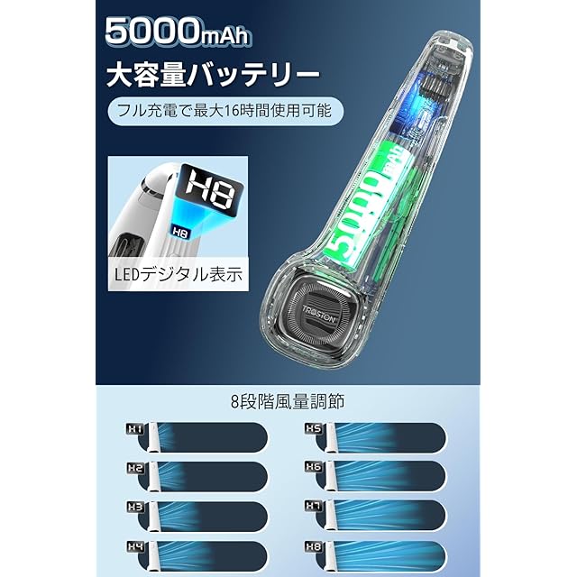 【長持ちバッテリー&選べる8段階風量】 首掛け扇風機は5000mAhの大容量バッテリーを内蔵、安全性もパッチリです。最大16時間の送風が可能、一日中に涼しさを楽しめます。外出時も安心して持ち歩けます。また、気分に合わせて風力は8段階調節可能です。 (※使用可能時間は使用方法などの要因によって大きく変動します。)。