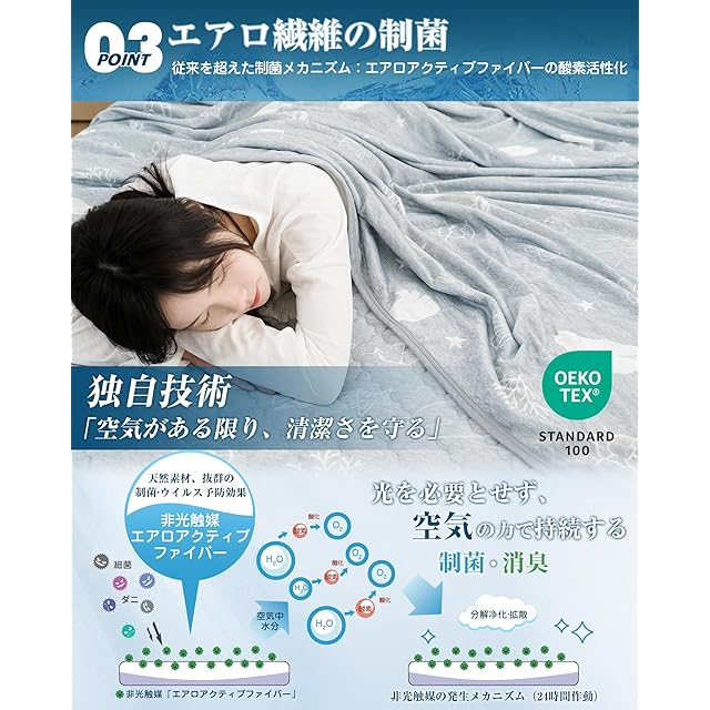 【エアロ繊維の制菌】 湿気や汗でジメジメする夏は、菌が繁殖しやすい季節です。エアロアクティブファイバーの酸素活性化で、空気がある限り、24時間持続的に制菌消臭作用を発揮する。低ホルムアルデヒドなのでお子様にも安心。洗濯しても抗菌防臭・防ダニ効果は持続します。
