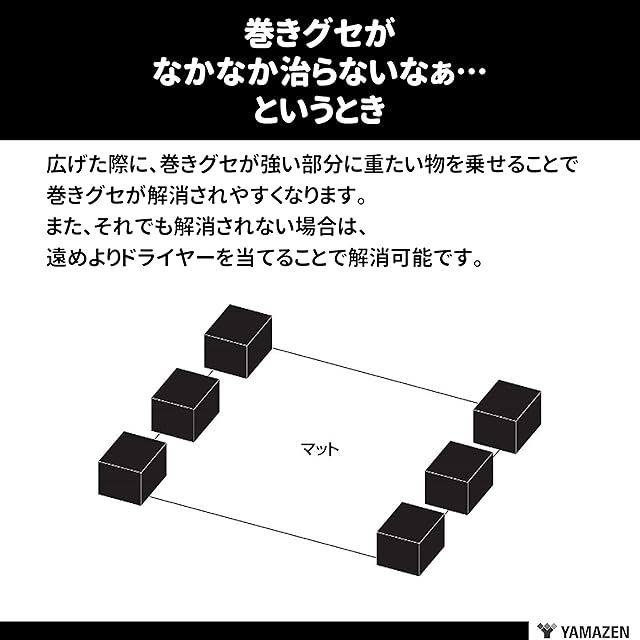 【柔らかく広げやすい】当社従来品のマットと比較して、柔らかく広げやすくなりました。※ロール梱包・材質のため、開封直後は固く丸まっておりますので、重しなどを置いて平らにして下さい。