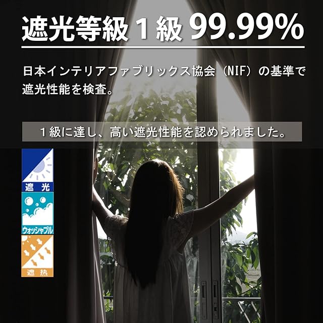 1級遮光:250gsmポリエステル生地(三層構造)で仕上げた一級遮光カーテン、遮光率は99.99%以上、外からの光をほとんど通さなく、昼間でもぐっすり眠れます。ホームシアターを楽しんでいただき、室内の光が外に漏れることを防止し、外から部屋中の様子が見えなく、プライバシーをしっかりと守ります。一人暮らしの女性により安心感を与えます。(カーテンの遮光効果は色により若干差があるのでご理解の上、ご了承お願い致します。よりいい遮光効果を追求する方は、濃い色のカーテンをお勧め致します。)