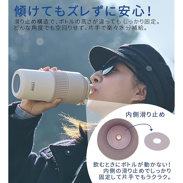 マルチ対応設計:スペーサー付きで350ml〜680mlの様々なペットボトルにフィット。本体サイズは高さ17.6cm、胴径7.6cm、飲み口3.8cm、重さは約266.7g。市販の多くのペットボトルに対応する保冷ボトルです。底面には滑り止めパッドを備え、安定して置けます。さらに付属のシリコン製スペーサーは、サイズ調整だけでなく、外側に装着すれば滑り止めパーツとしても使用可能。用途に応じて活用できる実用設計です。