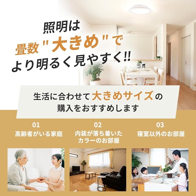 畳数がお部屋の1つ上の畳数を選ぶことで部屋の隅まで明るく照らし、長年快適に過ごせる。さらに、大きい畳数を選ぶことで10年後も明るさが続くので、買い替えの頻度を減らすことが可能になる。