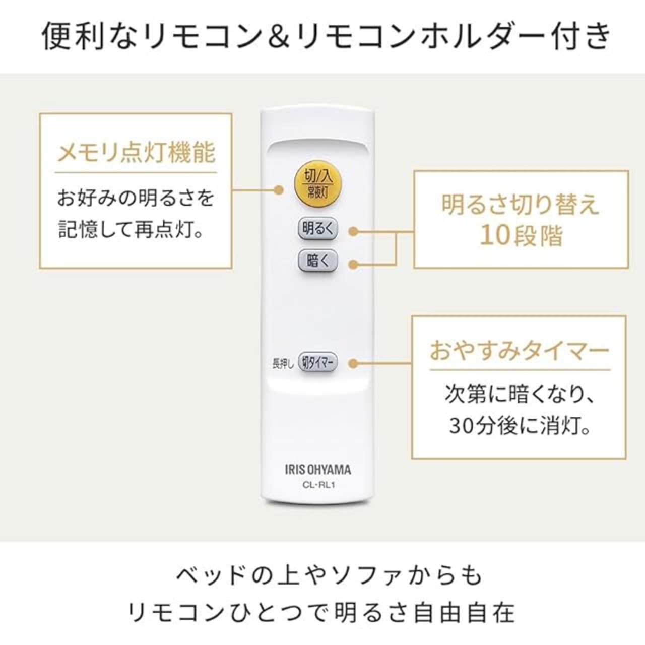 【調光】明るさ切り替え10段階!読書や勉強時、くつろぎの時間、映画鑑賞等使用用途に合わせてお好みの明るさに。【メモリ点灯機能】お好みの明るさを記憶して再点灯♪【おやすみタイマー】次第に暗くなり30分後に消灯。
