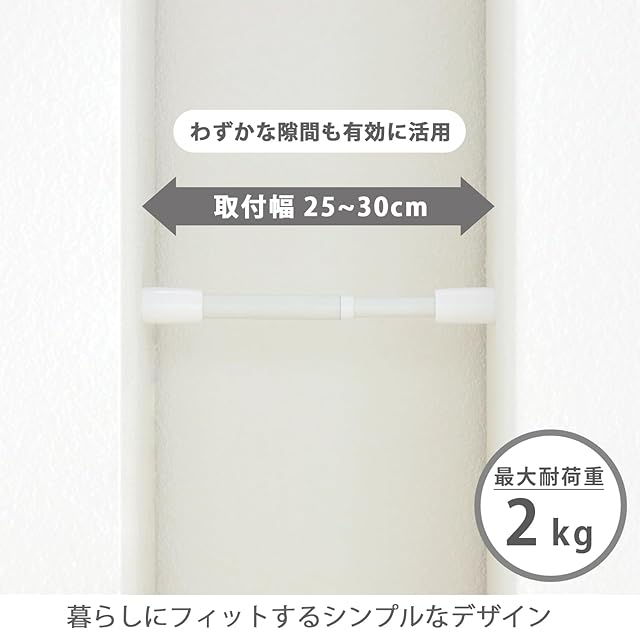 スリムなポールでも耐荷重最大15kgで、デッドスペースに安定して収納を追加可能。カフェカーテンから厚手のカーテンまで手軽に取り付けられる。