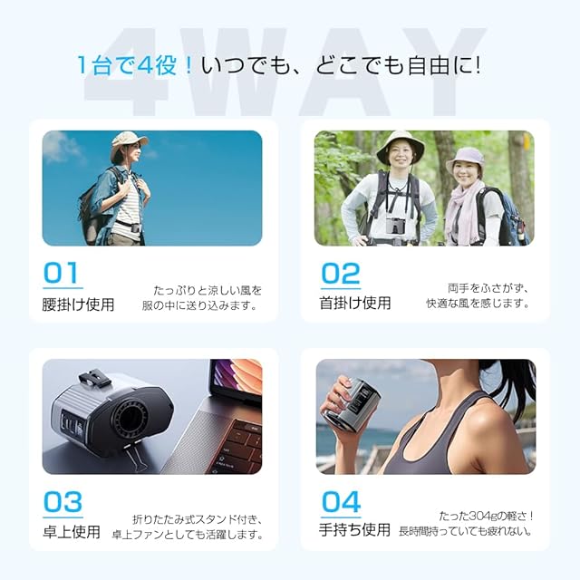 【2025年新登場4in1ベルトファン&暑さ対策グッズ】 この小型扇風機は、首掛け・腰掛け・手持ち・卓上と4通りの使い方ができる携帯扇風機です。付属のストラップを使って首掛け式扇風機として使用、ベルトにクリップして腰掛け扇風機として背中に風を供給、クリップを使って机の上に置いて小型卓上扇風機として、小型超軽量なので、手持ち扇風機として使えます。