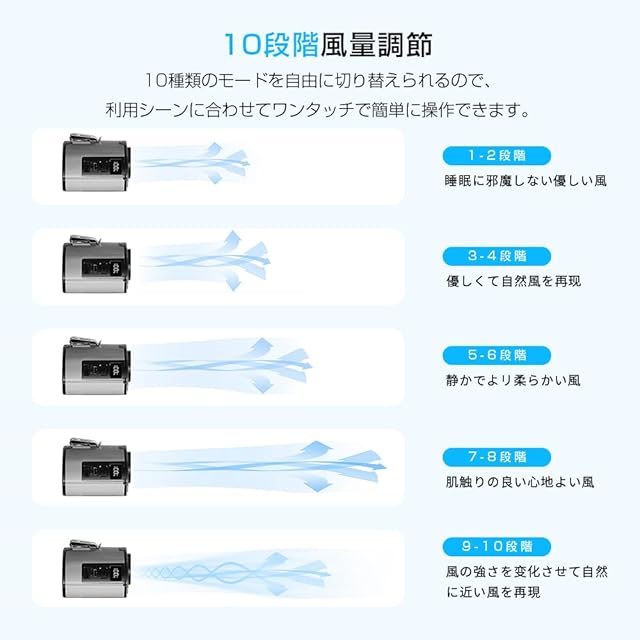 【10段階の風速調節 ·ブラシレスモーター採用 】微風から強風までお好みに合わせて風速を細かく設定できます。風速6.6m/sの1段階モードから風速15.5m/sの10段階モードまで10段階調節可能。屋外作業やスポーツ時も快適な風を提供し、急な暑さにも対応します。シンプルなワンボタンデザインで、風量の調整はさらに操作便利です。立体騒音低減、低騒音運転、急速冷却を実現する。小型で軽量で持ち運びに便利なだけでなく、強力なモーターが高速で回転し、負圧により空気循環が風力を増大させ、風力をアップします。最大回転数は驚異の15800rpmを実現。暑い夏にはエアコンのような涼しい風を楽しむことができます。