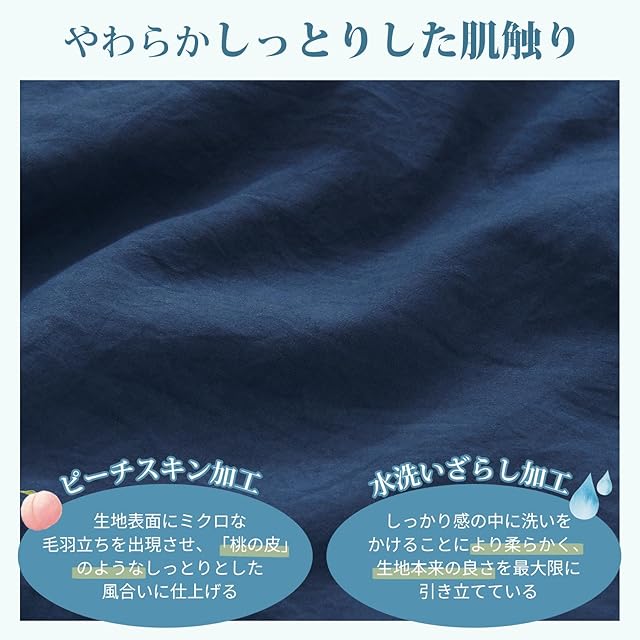 <ワッシャー加工>:ワッシャーとは、洗いっぱなしのような風合い(シワ)を加える技術のことを指す。肌に直接ふれるものだから、洗いざらしのやわらかな生地が肌になじむ。素肌に触れても気持よく睡眠環境を作り上げる。