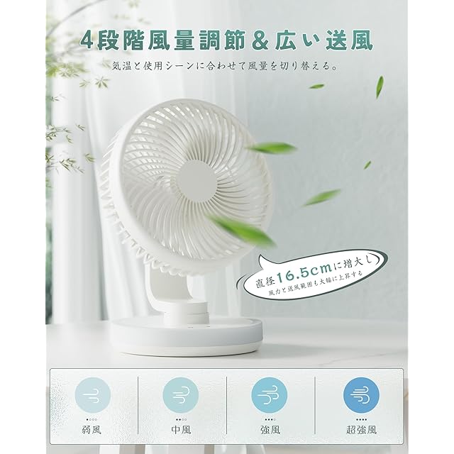 【4段風量調節&広範囲送風】✅この卓上扇風機は、4段階の風量調節が可能で、さまざまなシーンにぴったり対応します。静かな読書やリラックスタイムには優しい弱風、中程度の風量で日常的に快適に過ごせ、暑い日には強風・超強風で瞬時に涼しさを実感できます。ファンの直径は16.5cmと一般的な卓上扇風機よりも大きく、広範囲にわたって風を送り、より効率的に涼しさを届けます。