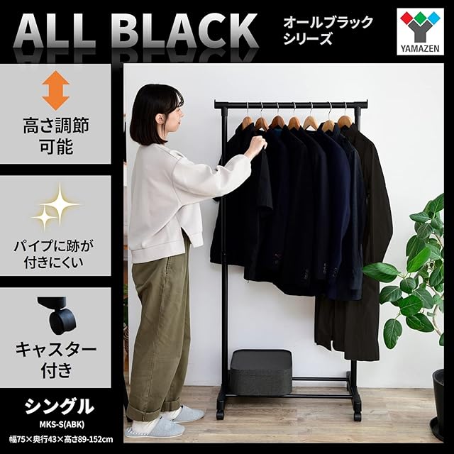 山善(YAMAZEN) ハンガーラック (パイプハンガー) キャスター付き 縦伸縮 シングル 幅75×奥行43×高さ89-152cm 組立品 オールブラック MKS-S(ABK)