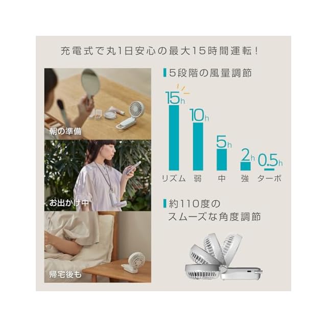 夏場に限らず、幅広い場面で使用できるリズムのモバイルファンで、くつろぎの時間をお過ごしください。