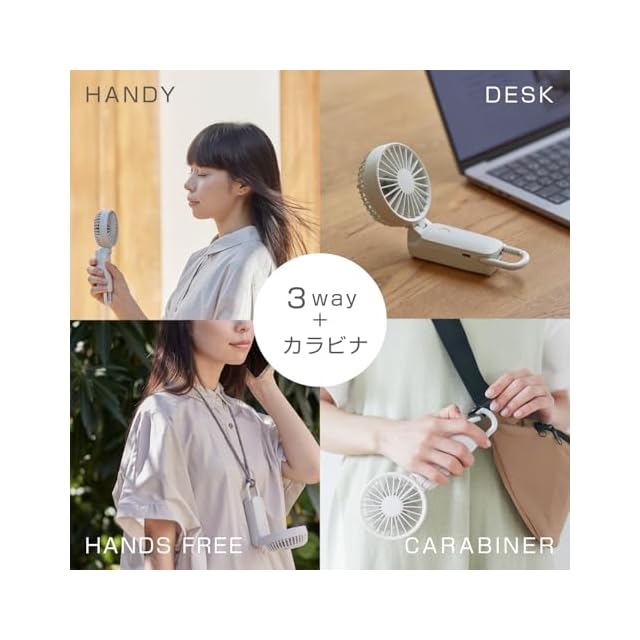 ファン構造:2枚羽根を向きを変えて前後に配置したリズム独自の「2重反転ファン構造」。後ろのファンで空気を集め、前のファンで筒状の風を届けます。2枚の羽根でコンパクトサイズなのに大風量を実現。どこでも使える3WAY:手持ち扇風機(ハンディ)、卓上扇風機、首掛け扇風機(ハンズフリー)として。さらに、イベントや旅行・お出掛けなど、持ち運びに便利なカラビナ付きです。