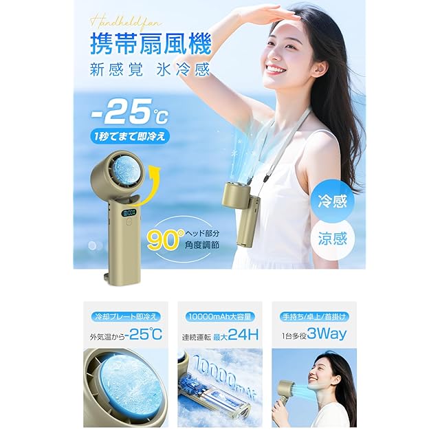 【1秒で即冷え -25℃瞬間冷却扇風機】冷却プレート付きハンディファンで、冷却モードに切り替えると、プレート部が急速に冷却し、それを頬やおでこ、手首、首元などに当てたら、まるで氷のよう冷たさが感じられ、火照った肌が瞬間にクールダウン。猛暑日の通勤通学、街歩き、スポーツ観戦、花火大会、お祭り、野外イベント、夏フェス、ライブ、キャンプ、旅行など屋外の熱中症対策にぴったりで、一度使うと手放せないハンディクーラーです。