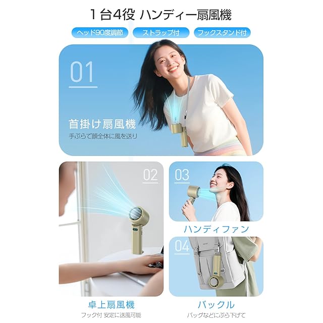 【手持ち/首掛け/卓上/吊り下げ一台四役扇風機】付属のネックストラップをつけると、首掛け扇風機になり、顔や首周りに涼しさを送ります。フックスタンドを使えば、デスクワーク中の暑さ対策に最適な卓上扇風機に変身。さらに、手に持って自由に風をあびたり、フックをリュックサック、テントや木の枝に吊り下げたり、どんなシーンでも使いやすいマルチファン。ヘッドが90°角度調整可能、卓上扇風機や首掛け扇風機として使用する時にご自由にお好きな角度で風を吹くことができます。