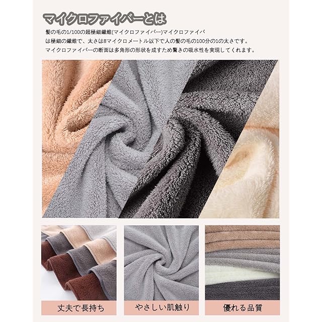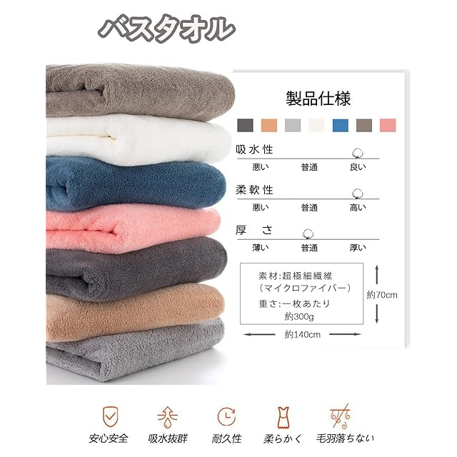 【材質】:ポリエステル85%、ポリアミド15%高級マイクロファイバー素材を採用 - このタオルは毛髪の1/100超微細繊維(マイクロファイバー)で作られたバスタオルです、触り心地最高、優しくてやわ らかい肌触りです、やさし い仕上げに蛍光染料は使用 しておりません。品質:このバスタオルが色褪せない、毛羽落ちしないことを保証します。