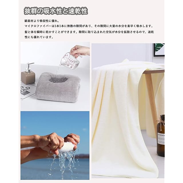 【抜群の吸水性と速乾性】綿の素材より吸水性が優れます。マイクロファイバー素材の表面は数えられない隙間があり、その隙間に大量の水分を素早い吸水できます。髪や肌にそっと当てるだけで水分が吸収される素材であり、また汚れも落としやすい特徴があります。隙間に取り込まれた空気が水分を拡散させるので、速乾性のポイントで、バスタオルの雑菌を抑え、健康を保つことができます。