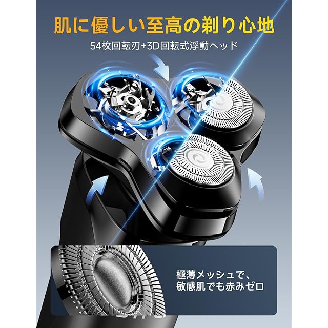 【3つの回転ヘッド、54枚の刃でスムーズな剃り心地】3つの回転ヘッドと54枚の高精度な刀刃を搭載。これにより、細かい毛や太い毛もしっかりキャッチし、素早く均等に剃り上げます。さらに、肌に優しく、刃が肌に直接触れないため、敏感肌の方でも安心して使用できます。