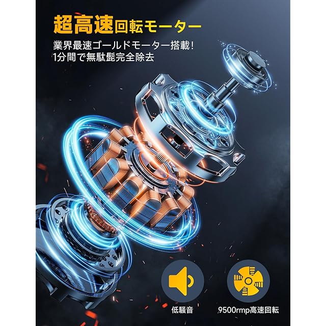 【高速回転モーターと低騒音設計】強力な高速回転モーターにより、剃る速度が速く、効率的に剃ることができます。また、低騒音設計により、静かな使用感を実現。朝の忙しい時間帯でも、周りに気を使うことなく快適に使用できます。