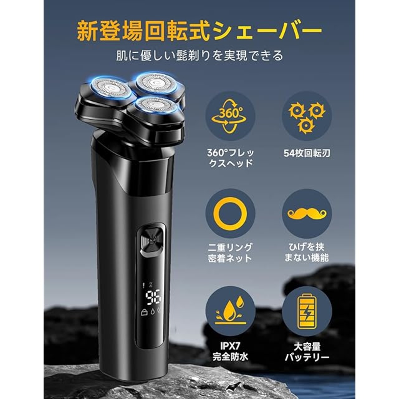 電動シェーバー 【2025新登場 USB充電式】 シェーバー ひげそり 髭剃り 3つの回転ヘッド 54枚刃 二重剃刀ネット 深剃り 低騒音 IPX7完全防水 1時間急速充電 乾湿両用 軽量 高速回転モーター LEDディスプレイ付き 360°フレックスヘッド 男性用 シェーバー 父の日 誕生日プレゼント
