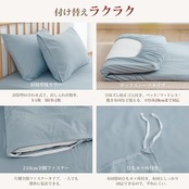 <セット内容&仕様>:「掛け布団カバー(1枚)」:片側に210cm全開ファスナー使用 / 布団留めひも8ヶ所付き ・ 「ボックスシーツ(1枚)」:全周ズレ防止ゴム付き / 通常サイズより大きめなので、高さ3-28cmの敷き布団とマットレスの底まで包む可能 ・ 「枕カバー(1枚)」:封筒型で、出し入れが簡単