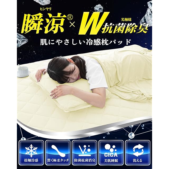 【【除菌】 【抗菌】 【消臭】を光触媒加工で解決】光触媒とは、太陽や蛍光灯などの光が当たることで、含有酸化チタンからモノを引き付けようとするイオン吸着力と同時に強力な酸化力が発生します。それにより、有害物質を無害化、分解し、増殖を抑えることができる環境浄化技術です。湿気や汗から出るニオイや細菌の心配もありません。いつでもひんやり枕パッドを清潔にお使いいただけます!