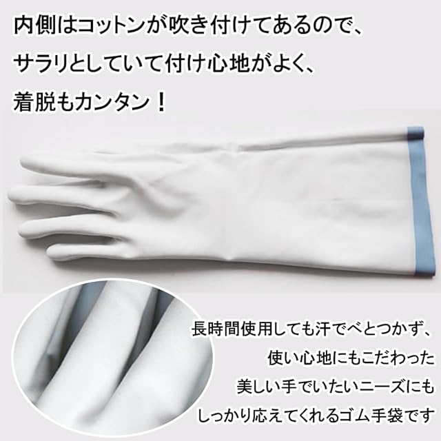 【内側コットンでサラリと着脱がラク】内側はコットンが吹き付けてあるので、サラリとしていて付け心地がとってもいい。着脱も楽です。裾がロールアップされているので短めの丈ですが、水が伝って入りづらく、ずり落ちにくいのもポイント。ガーデニング作業やDIY、キャンプなどで活躍してくれるゴム手袋です。