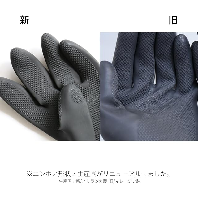 【商品仕様】サイズ:全長305mm、手のひらまわり205mm、中指の長さ80mm、素材:表:天然ゴム/裏:綿(植毛)、スリランカ製※エンボス形状・生産国がリニューアルしました。旧/マレーシア製