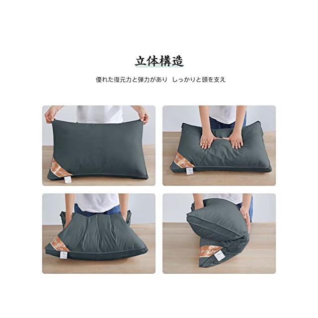【立体構造】柔らかさと高反発性を兼ね備えた構造であり、ボリューム感よく、羽毛のように叩けばふわーっと飛 び散る性質をもっています。適度な復元力と弾力があり、しっかりと頭を支え、お好きな寝姿でぐっすり眠れます。