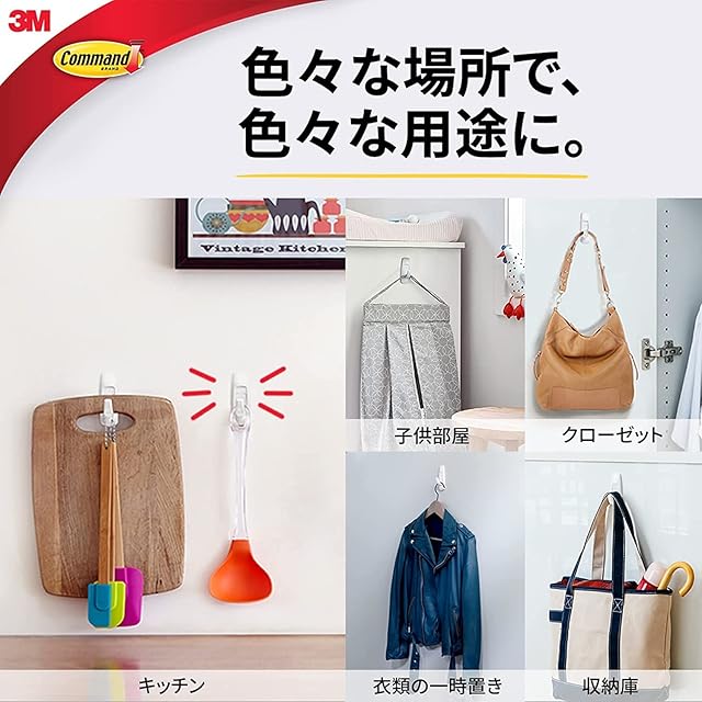 【ツルツル面にしっかり固定】ガラスやタイルなど、屋内の様々な平滑面にしっかりと設置できる強力なコマンド フック。キッチン用品や小物の整理収納、バッグや上着の一時置きに。