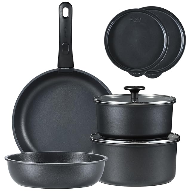 【セット内容】鍋18cm/0.41kg、鍋20cm/0.41kg、フライパン 22cm/0.43kg、フライパン26cm/0.59kg、18cmガラス蓋、20cmガラス蓋、18cmシール蓋、20cmシール蓋、専用取っ手×1本、梱包重量(約): 3.58kg
