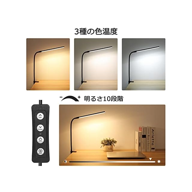 【3種の色温度・明るさ10段階】電球色、白色、昼光色の3段階調色と10段階の調光機能が搭載され、使用シーンに合わせてボタンでお好みの色と明るさが変えられます。メモリー機能により、次回使用時に最後のモードと明るさが維持されます。明るさは最大460ルーメンとなり、他の製品より明るくて、作業や勉強などに最適です!