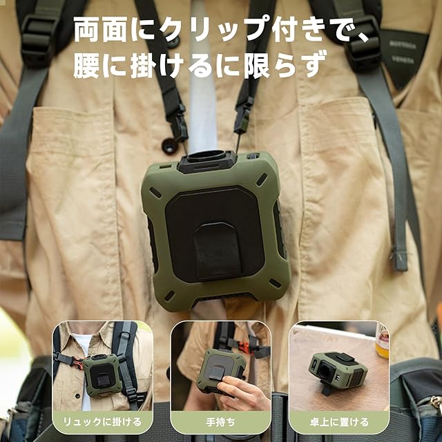 【一台多役】 わずか371gの軽量設計で、腰に装着するのはもちろん、首に掛けて使うことも可能。アウトドアや作業時にも最適です。本体両端には2つのクリップが付いており、付属のストラップを使えば首掛けも簡単。移動中や作業中でも首元から顔周りに心地よい風を送り、両手がふさがることもありません。さらに、オフィスや自宅では卓上扇風機としても使えるため、シーンを選ばず活躍します。