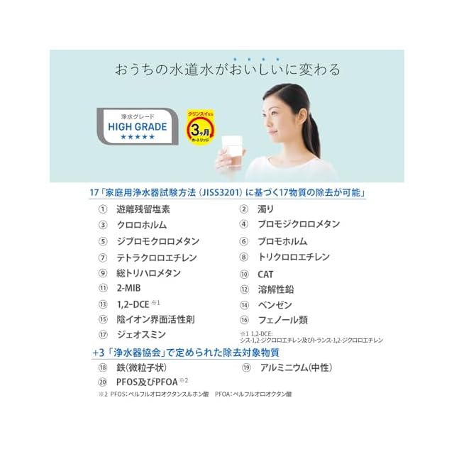 浄水器協会(JWPA)で定められた規格基準(JWPAS B基準)に規定された試験方法による試験を実施し、PFOS、PFOAを除去できることが確認できました。