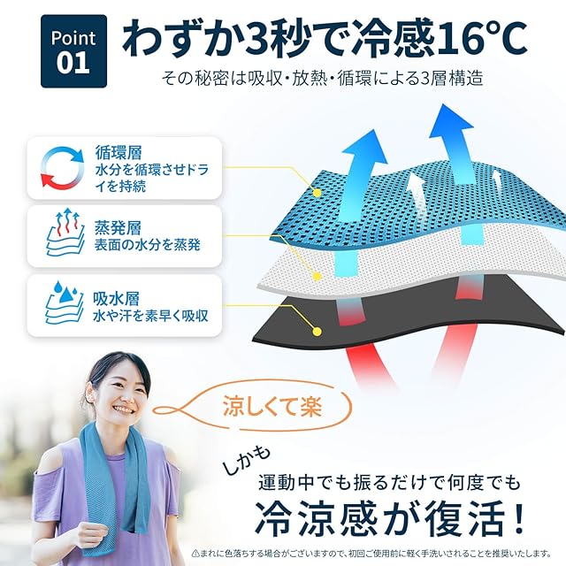 【長時間持続】特殊素材の3層構造で“冷感”を長時間キープし、水分を効率的に蒸発させて快適さを維持。真夏の「暑さ対策」「熱中症対策グッズ」として暑さ対策グッズ最強クラスの性能を発揮し、アウトドア・スポーツ・作業現場で大活躍。ひんやり“冷感タオル”兼“クールタオル”として首に巻けば即座に冷却、“汗拭きタオル”としても不快感を抑えます。