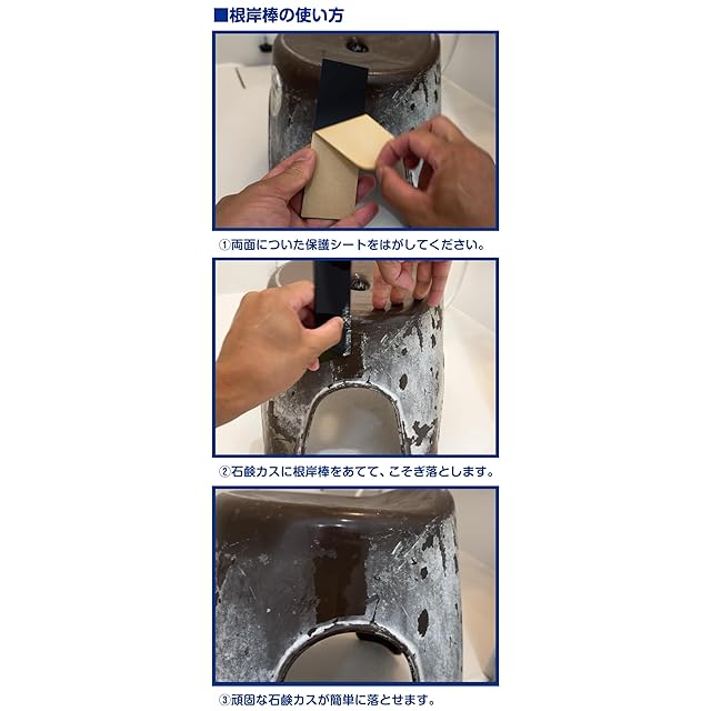 ■用途:浴室の石鹸カス除去 ■使用前の準備:両面についた保護シートを外してから使用します。 ■使用方法:固まった石鹸カスに根岸棒を優しく当てて、こそぎ落とすように使用してください。 ■使用上の注意:光沢のある素材や黒色の素材に使用すると、キズが目立つことがあるので注意してください。キズが心配な場合は、目立たないところで試してから使用してください。絶対にキズをつけたくないところには使用するのを控えてください。 角やエッジは鋭くなっているので注意してください。小さなお子様の手の届くところに置かないでください。使用後はしっかり洗い流し、乾燥させて保管してください。廃棄する際は各自治体の定める方法に従って処理してください。