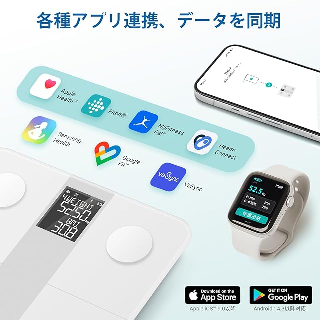 【安心の使いやすさ】Apple Health、Samsung Health、Fitbit、MyFitnessPalなどのサードパーティフィットネスアプリやスマートウォッチとシームレスに接続可能。高度なデータ送信技術によりプライバシーを保護しつつ、最大416日間のバッテリー寿命を実現します