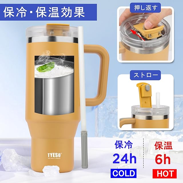 TYESO タンブラー 0.9L 水筒 保冷 ステンレスボトル ウォーターボトル ストロー 取っ手付き ジョッキ アウトドア 真空断熱 二重構造 広口 大容量 直飲 女の子 男の子 900ml イエロー