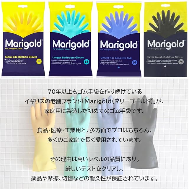 【Marigold(マリーゴールド)】1950年イギリスの老舗ブランド Marigold(マリーゴールド)は食器洗い用に特化して開発・発売されました。発売から約70年、プロ向けのグローブ会社が、家庭用に製造した初めてのゴム手袋は使い方や使う人のことを考えて作られ、食品・医療・工業用と、多方面でプロはもちろん多くの家庭で長く愛用されています。その理由は高いレベルの品質にあり。厳しいテストをクリアし、薬品や摩擦、切創などの耐久性がされています。
