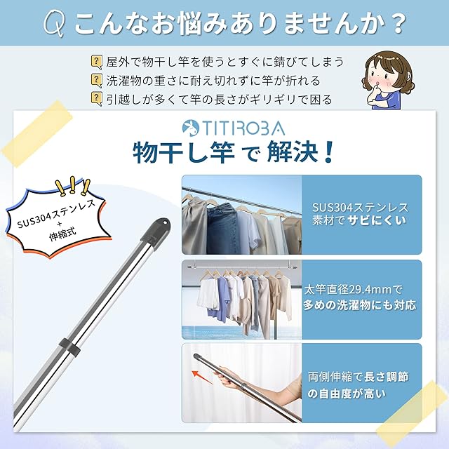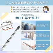【お客様の声に応える製品開発】TITIROBA物干し竿は、耐食性・耐酸性・耐孔食性・隙間腐食への耐性にすぐれたSUS304ステンレスが採用されています。主体SUS304ステンレスパイプと伸縮部SUS304ステンレスクラッドパイプの組み合わせは、サビや腐食に強いだけではなく、伸縮部はクラッドパイプで強度が高くなり、家族分の洗濯物や布団を安心して干せます。