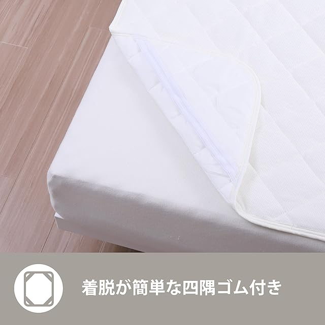 裏面の四隅にゴムが付いているのでズレにくく、取り付けも簡単。敷き布団、マットレスどちらでもお使いいただけます。高耐久と伸縮性に優れた高性能ゴムを使用しているので伸びにくなっています。