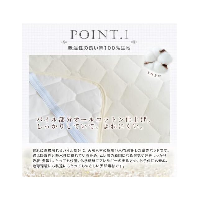 【吸湿性抜群の綿100%パイル】サイズ:シングル・100x200cm;表側パイル部分:綿100%;表側グランド部分:ポリエステル100%;中綿:ポリエステル・抗菌防臭帝人(TEIJIN)綿含み。仕様:四隅ゴムバンド付き。敷きパッドのお肌に直接触れるパイル部分に吸湿性抜群の天然素材の綿100%を使用し、湿気や汗を吸収でき、寝心地快適、春・夏・秋・冬を通してお使いいただけます。