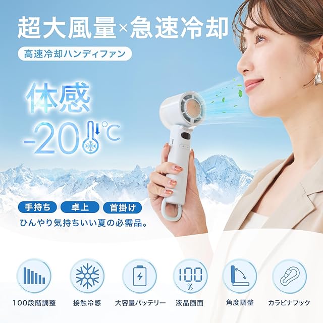 【100段階の超強風量・1秒で瞬間冷却・最大-25℃冷感】本製品の手持ち扇風機は100段階の風量調節に対応しており、最大風速は約5.8m/s。また、冷却ボタンを搭載しており、スイッチを押すとわずか1秒でプレートが冷え、即クールダウン。ひんやりとした感覚が肌に素早く伝わります。※ご注意:冷却機能はファンが作動している状態でのみ使用可能で、単独では作動しません。