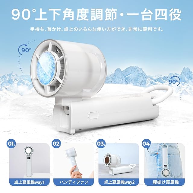 【多機能デザイン|卓上・手持ち・吊り下げ・折りたたみ自由自在】本製品の冷却ハンディファンは、90度の角度調整が可能で、卓上に安定して置いて使用することも、手に持って使うこともできます。底部には便利なフックが付いており、バッグやベルトに簡単に取り付け可能。持ち運びにも非常に便利です。