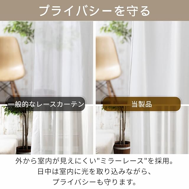 【紫外線からお肌・家具を守る】外から室内が見えにくい「ミラーレース」を採用。日中は室内に光を取り込みながら、UVカット&プライバシーも守る。