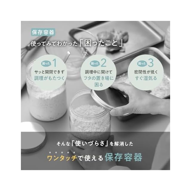 【いつでも開封したてのおいしさ】二つのパッキンでしっかり閉まって湿気を防ぎ、ワンタッチで開く保存容器。小麦粉1㎏が袋ごとピッタリ入るサイズです。