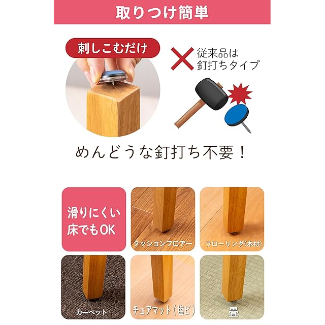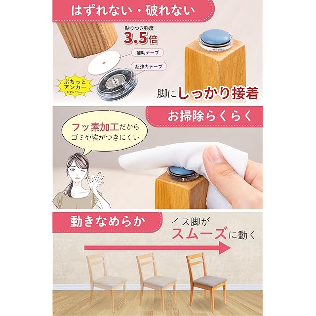 ✅【ぷちっとアンカーでしっかり固定】 特許 第7638496号の固定技術により、椅子脚に強固に食いつき取れにくい構造になっています。 両面テープのみの取付に比べて3.5倍の取付強度になっています。取付け易くしかもしっかり取り付くことにこだわり、数多くの試作を繰り返した結果、短い1本釘を採用しました。
