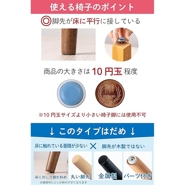 ✅【サイズ選び不要】 木製脚でコインサイズより大きい足ならどんな形状でも取り付け可能。めんどうな採寸作業は不要です。前後の足の形状が違うデザインの椅子にも対応可能です。