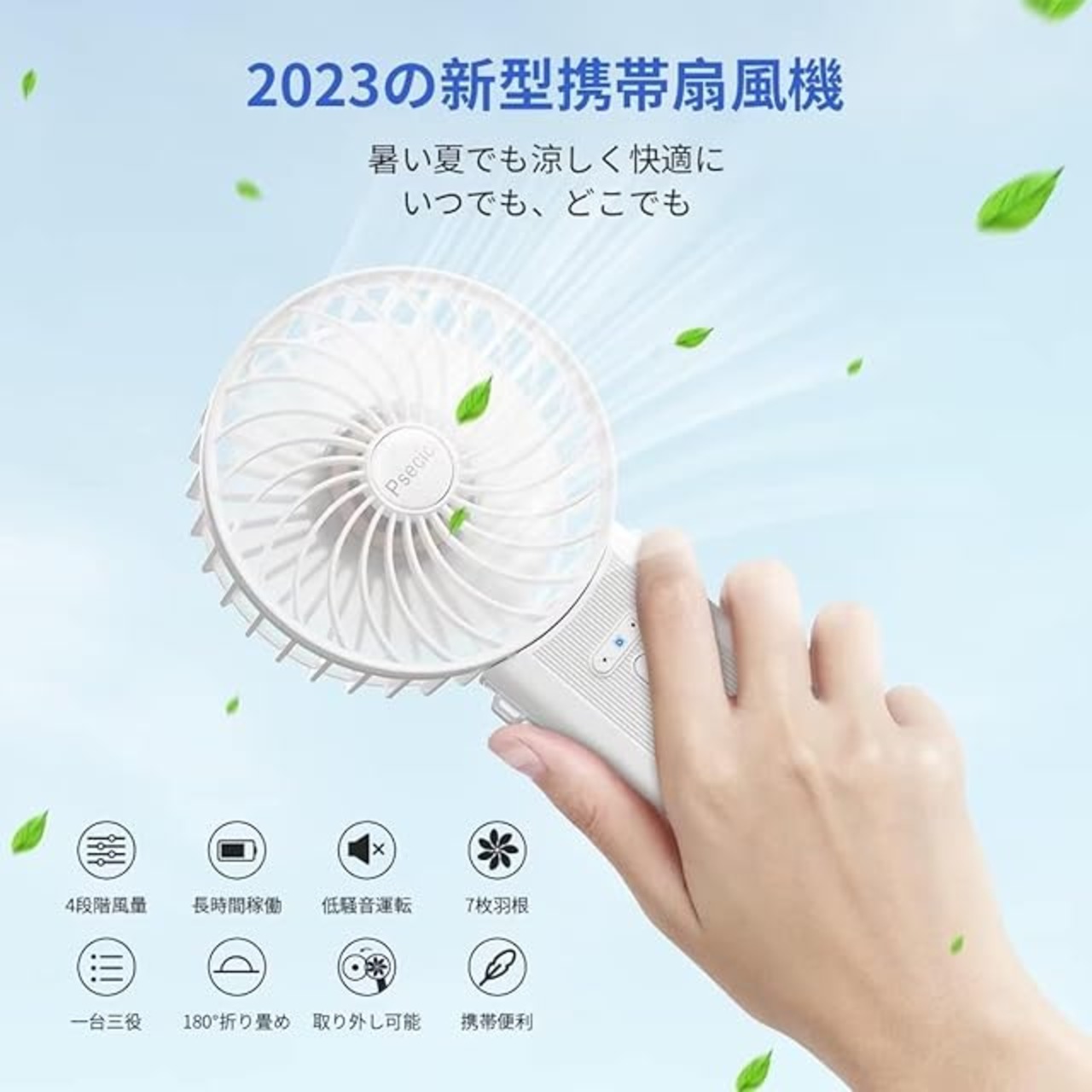 【手持ち/首掛け/卓上3in1携帯扇風機登場】psecici携帯扇風機は手持ち扇風機・卓上扇風機・首掛け扇風機3つの機能を同時に兼ね備えています。✨扇風機本体にストラップ取り付け穴を備え、付属のストラップと併用すると首掛け扇風機として使え、両手が解放するため、長時間使っても疲れにくく、作業中やスポーツなどの場合に勧めします。【180°折り畳め】伝統の卓上扇風機と違う、弊社の扇風機は折り畳むことで卓上機能を実現します。上下方向に180°折り畳む可能、自分の好みに合わせて角度を調整できます。暑い季節、ちょっとしたお出かけから野外イベントまで活躍するハンディ扇風機です。注意充電中に以下の事を守ってください:①必ず付属の充電ケーブルをご使用ください。②アップルの電源アダプターをご使用しないでください。③必ず5v/2Aもしくは5v/1Aの外部電源と接続してください。