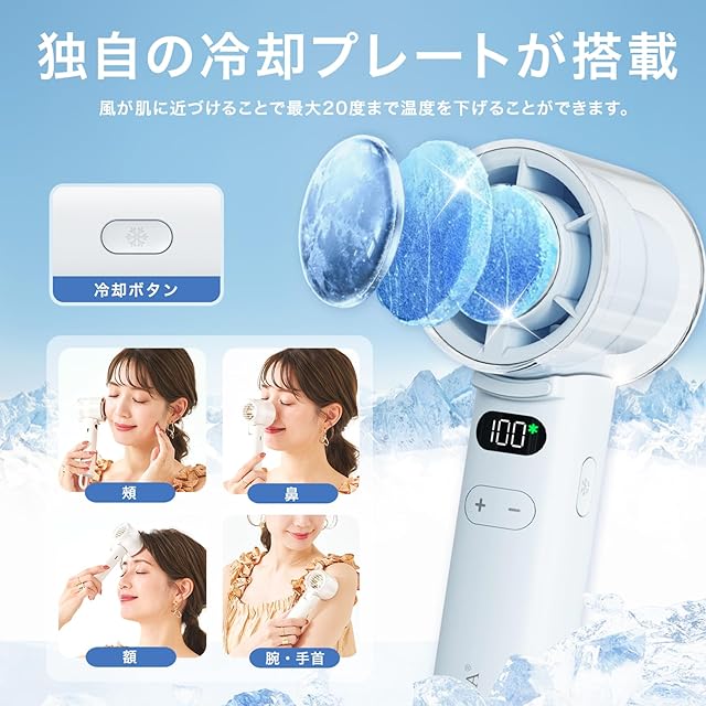 【100段階の超強風量・1秒で瞬間冷却・最大-25℃冷感】本製品の手持ち扇風機は100段階の風量調節に対応しており、最大風速は約5.8m/s。また、冷却ボタンを搭載しており、スイッチを押すとわずか1秒でプレートが冷え、即クールダウン。ひんやりとした感覚が肌に素早く伝わります。※ご注意:冷却機能はファンが作動している状態でのみ使用可能で、単独では作動しません。