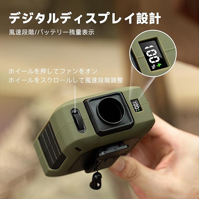 【最大26時間連続使用】 高効率なブラシレスモーターを採用し、微風モードでは最長26時間、最大風速では約4時間の連続運転が可能。風速は1〜100段階で細かく調整でき、屋内外を問わず、長時間にわたって快適な涼しさをお楽しみいただけます。