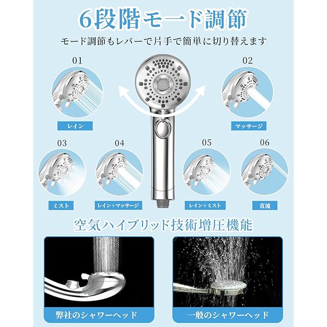 【驚く豊かな6種類出水モード★洗浄力びっくり】 6種類の出水モードを搭載しておるシャワーヘッド マイクロナノバブルは、シャワータイムをまるでSPAのような特別な体験に変えます。ストレートモードは全身を効率的に洗えます。柔らかなミストモードは顔に当てても刺激が低く良き肌あたりで顔を洗えます。ストレートミストモードは効率かつ優しくバスタイムに適。マッサージモードは体全体をリラックス。ストレートマッサージモードは程よく刺激を与えて汚れをしっかりと洗浄。力強いジェットモードは全身をスッキリ洗い流すほか、トイレの掃除にも役立ちます。細かな水流設計により、毛穴の奥までしっかりと洗浄。心地よい水圧が肌に優しく、リフレッシュ効果抜群です。シャワーの楽しさを再発見したい方にぴったりです。